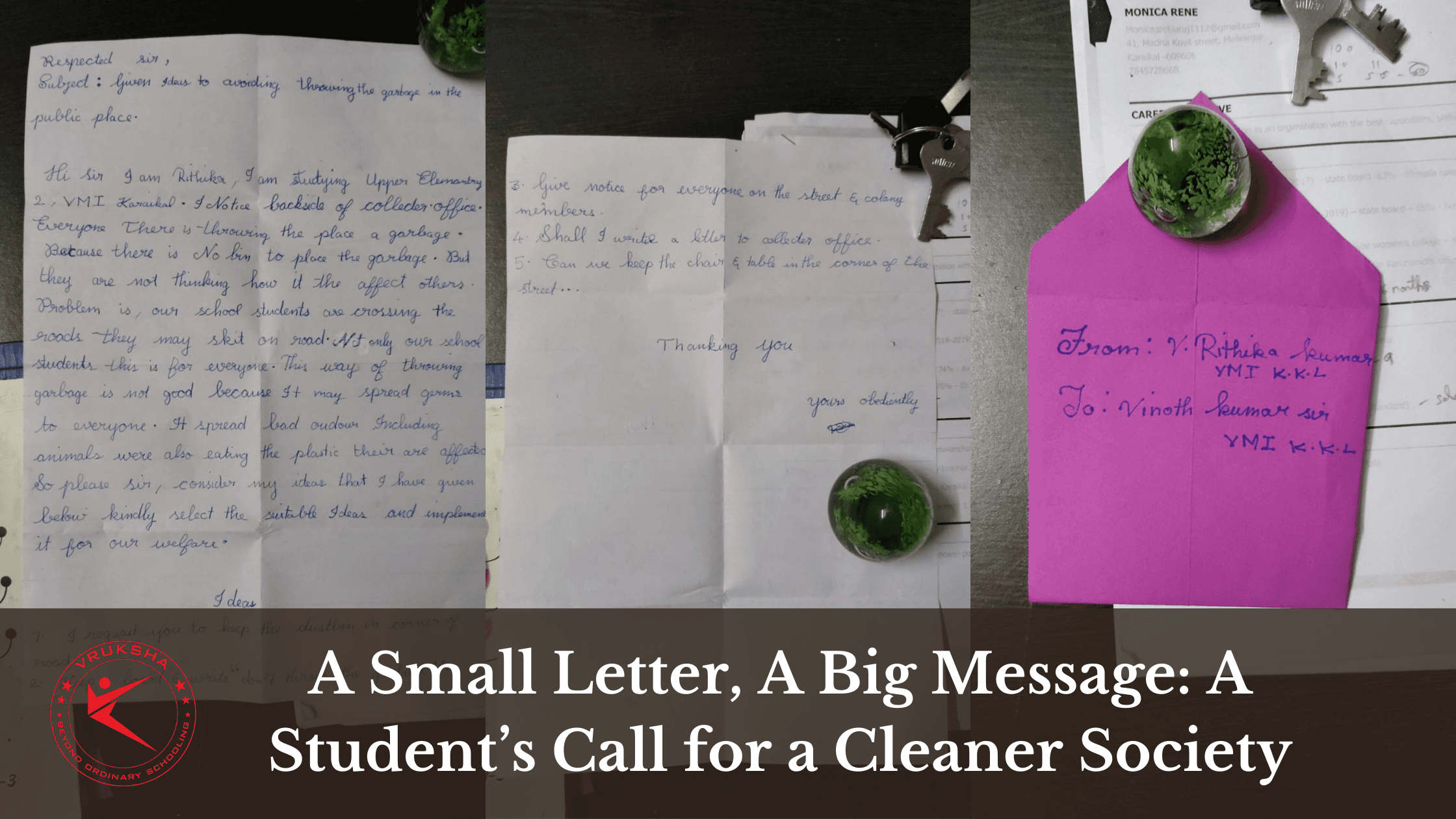 A young student named Rithika, 11 years old, from VMI Karaikal, wrote a heartfelt letter to her school authority about a serious issue in her area: people throwing garbage in a public place near the collector's office.